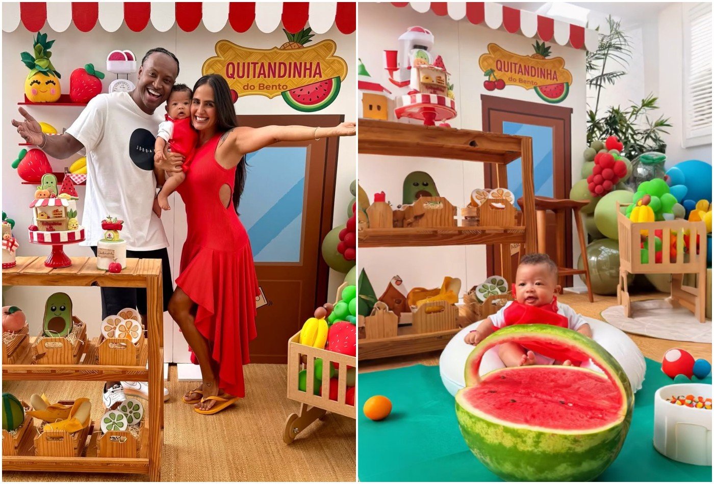 A decoração da festa refletiu o tema escolhido de forma lúdica e detalhada. O ambiente foi adornado com bexigas em formato de frutas, uma estante que simulava a exposição de “produtos” de uma quitanda e um painel que reproduzia a entrada de um estabelecimento do tipo. A ambientação criou um cenário “fofo”, como descrito, para o registro do momento em família.