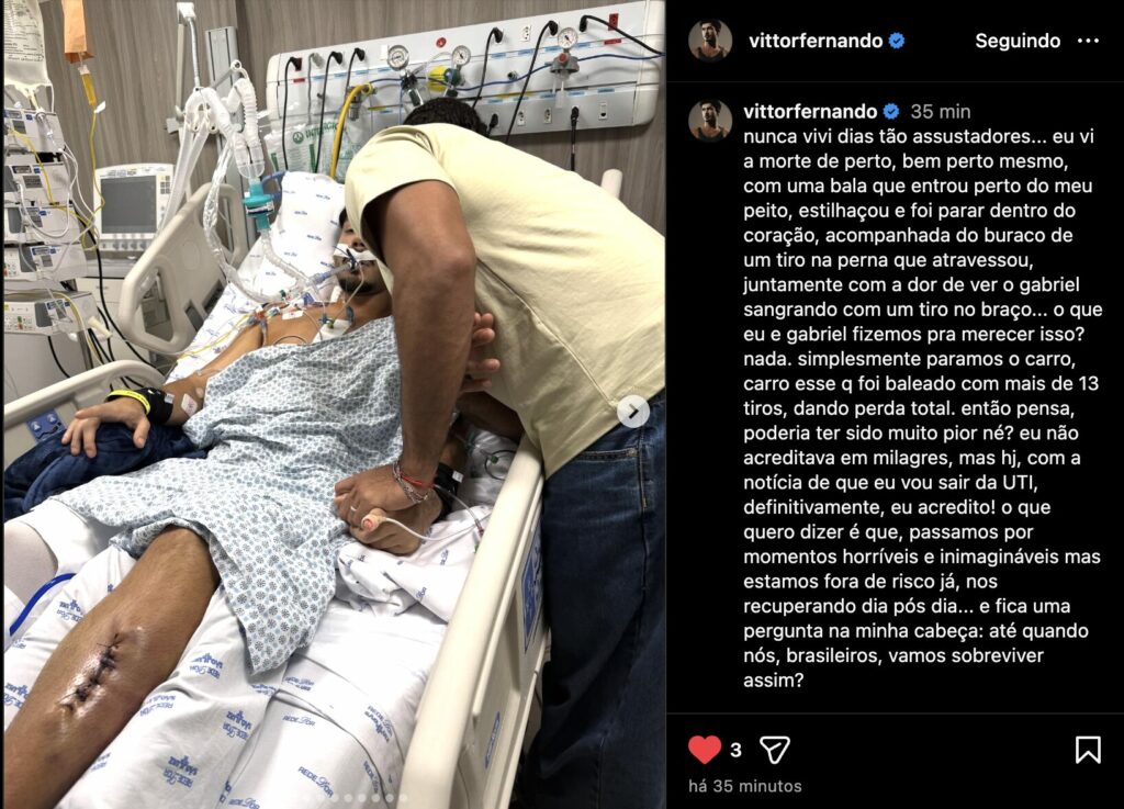 Vittor compartilhou a intensidade do ataque, mencionando que o veículo deles foi alvejado por mais de 13 tiros, resultando em perda total. Contudo, ele trouxe uma notícia positiva aos seus seguidores, anunciando que recebeu alta da Unidade de Terapia Intensiva (UTI) e que ambos estão fora de perigo, em processo de recuperação diária. O desabafo se encerrou com uma reflexão angustiante sobre a insegurança e a violência no Brasil.